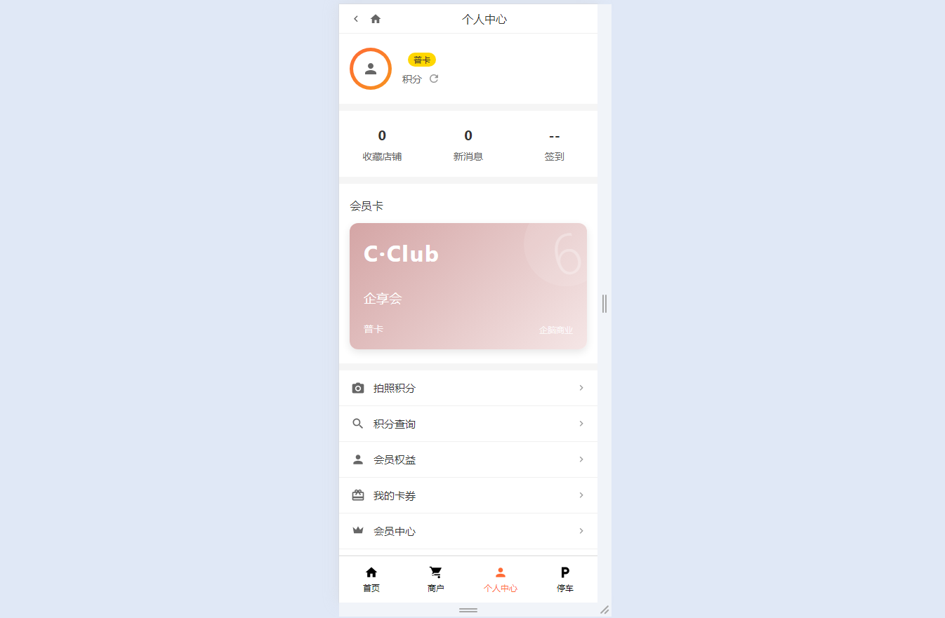 ● 个人中心管理 展示用户头像用户名会员等级和实时积分 统计收藏店铺数新消息数并支持签到 呈现精美会员卡 提供拍照积分积分查询会员权益等功能入口