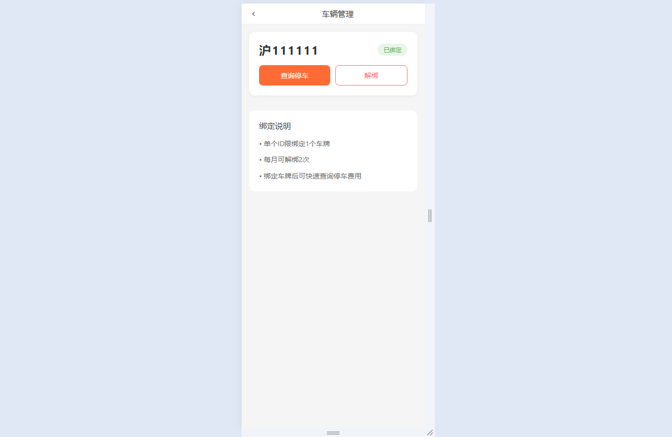 ● 车牌管理服务 支持全国30省市车牌前缀选择 适配新能源7位/普通6位车牌输入 自动聚焦验证 单个ID限绑1个车牌 每月可解绑2次 支持快速选择已绑车牌