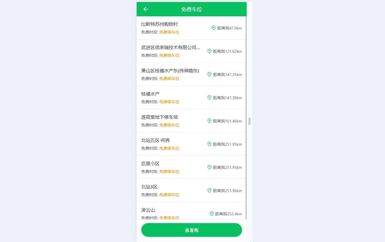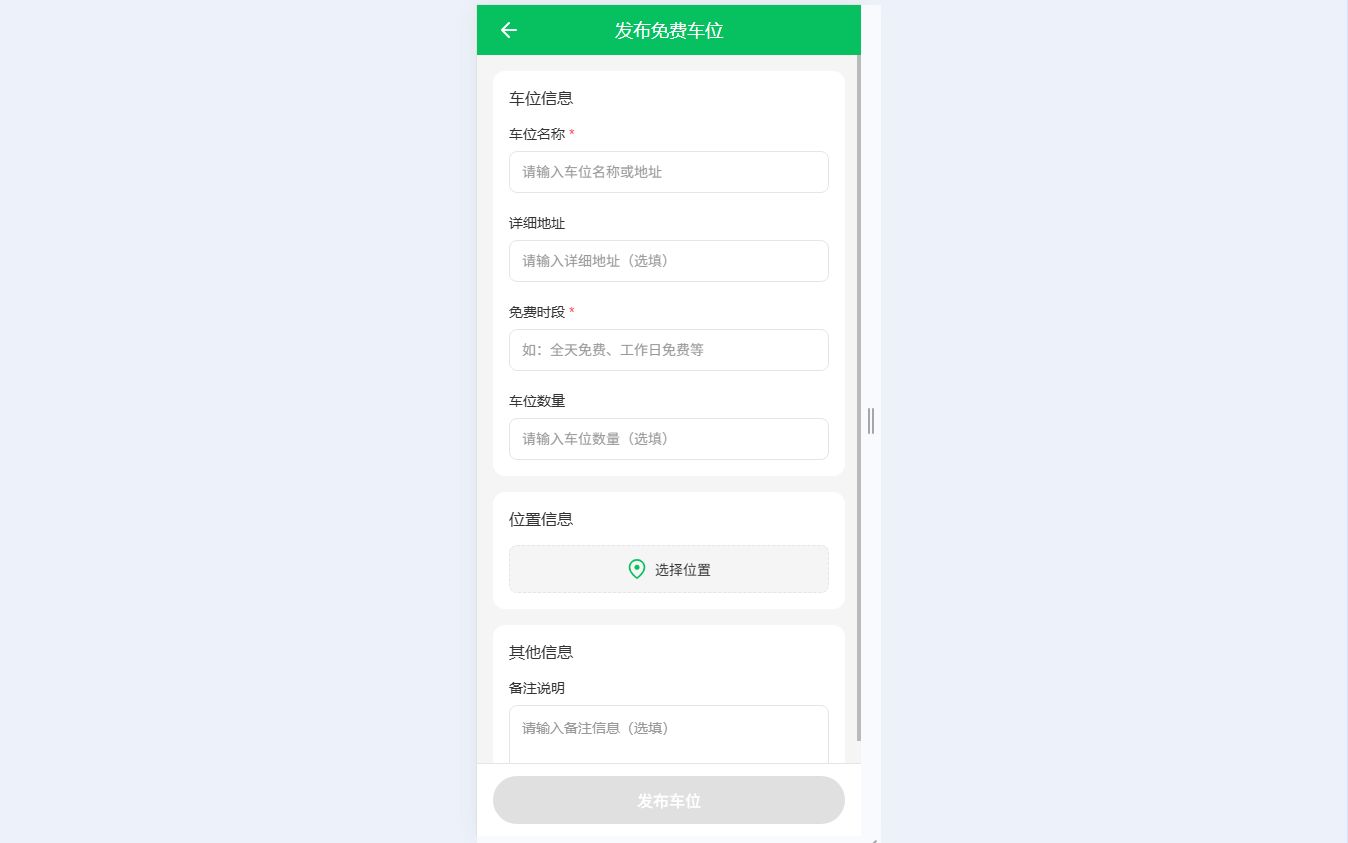 ● 车位发布功能 可发布免费/收费车位,免费车位录入基础信息并地图定位,收费车位支持多时段灵活定价与分类管理